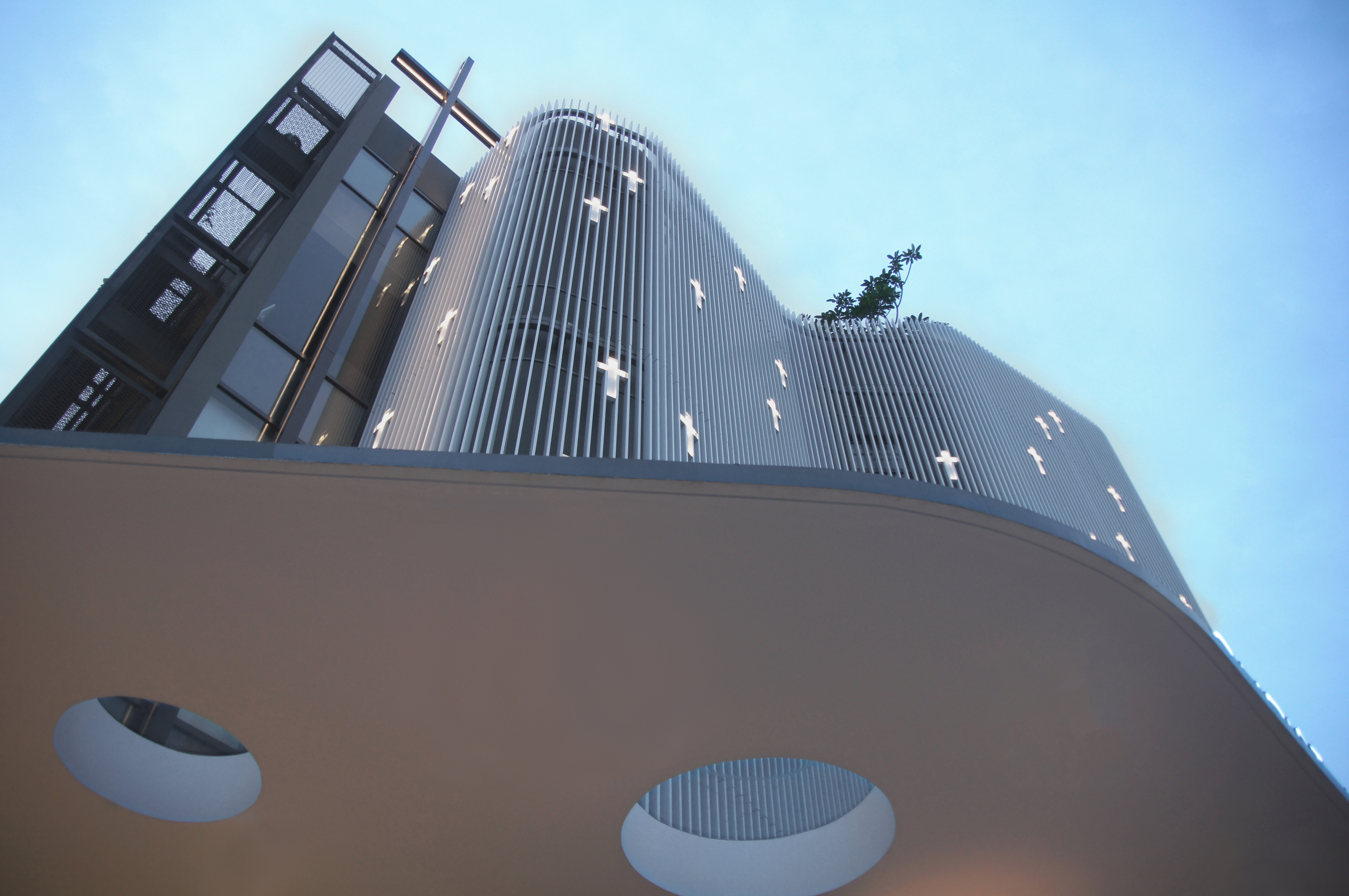 The highlight feature is the wave-like facade. Mr Ko says he was influenced by the church’s proximity to the sea. Clad in aluminium strips, little crosses are cut into the facade and they light up and glow against a muted backdrop in the night.